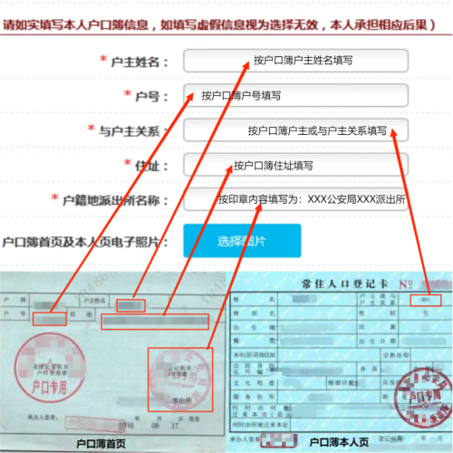 特別提醒:為確保申請享受放寬政策人員報(bào)名信息審核通過,請按下列示例圖片填寫戶口簿信息。如有戶口簿毀損、手寫痕跡、字體不清、印章模糊等無法識別信息的情況,請盡快到戶籍地公安機(jī)關(guān)重新打印戶口簿,清晰拍照后上傳,避免耽誤報(bào)名。