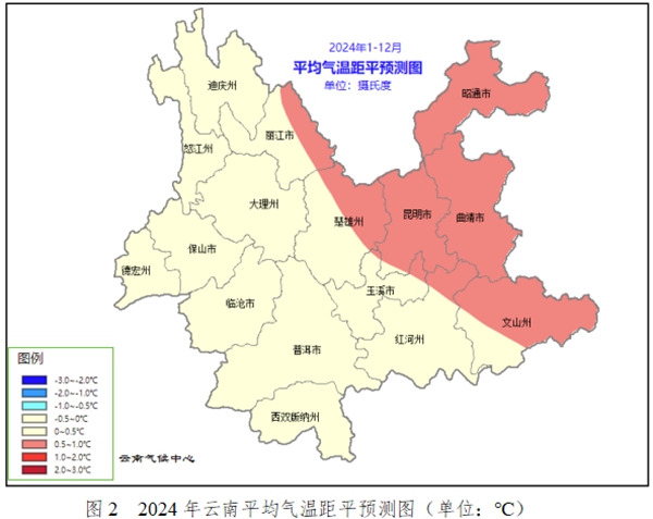 全省大部地區(qū)降水接近常年同期到偏少,氣溫接近常年同期到偏高。據(jù)氣象部門預(yù)測,降水:迪慶州西北部、怒江州北部、昭通市東北部、曲靖市東北部邊緣地區(qū)偏多10%—20%,其余大部地區(qū)接近常年同期到偏少,其中西雙版納州、普洱市中西部、臨滄市中南部、保山市南部、德宏州中南部偏少10%—20%(見圖1)。氣溫:全省大部地區(qū)接近常年同期到偏高,其中文山州中北部、曲靖市、昭通市、昆明市、楚雄州東北部、麗江市東部偏高0.5~1.0℃(見圖2)。重點關(guān)注:冬春季階段性強冷空氣引發(fā)的低溫冰凍雨雪天氣;2月下旬至4月上旬滇東北、滇西北及高海拔地區(qū)倒春寒天氣;春季冰雹大風(fēng)等強對流天氣;春末夏初氣象干旱;主汛期強降水引發(fā)的洪澇和地質(zhì)災(zāi)害,區(qū)域性氣象干旱。