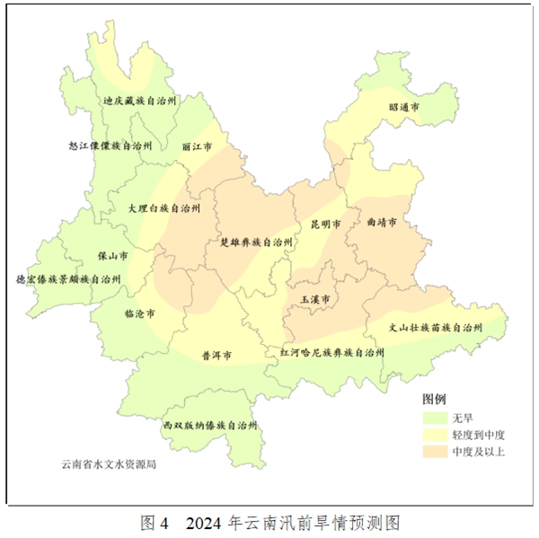 汛前尤其是4月至5月全省大部旱情偏重。據(jù)水文部門預(yù)測,預(yù)計1月至5月全省主要江河來水整體偏少,全省部分中小河流可能斷流,汛前昆明市主城區(qū)、玉溪市紅塔區(qū)、楚雄州楚雄市、臨滄市臨翔區(qū)存在較大供水壓力。滇中大部、滇東北大部、滇東大部、滇西北東部和北部、滇西東部、滇南北部發(fā)生輕度至中度干旱的可能性較大,其中曲靖市中南部、文山州北部、紅河州北部、玉溪市東部、昆明市東南部和北部、昭通市西南部、楚雄州大部、普洱市北部、臨滄市東北部、大理州東南部、麗江市南部以及金沙江、紅河、瀾滄江干熱河谷地區(qū)可能發(fā)生中度及以上干旱(見圖4),抗旱形勢嚴(yán)峻。建議:密切監(jiān)測旱情動態(tài),提前謀劃做好抗旱減災(zāi)準(zhǔn)備,提高抗旱保供能力,確保生活生產(chǎn)生態(tài)用水安全。