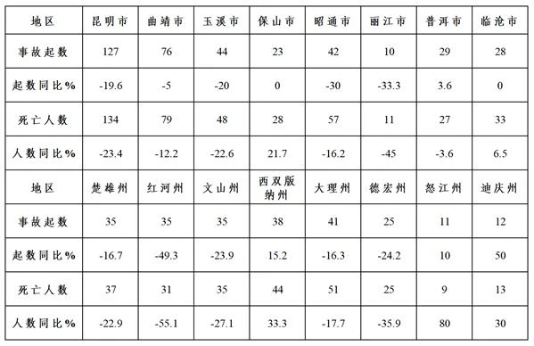 較大事故:昭通市5起、死亡18人,同比增加4起、12人;昆明市2起、死亡6人,同比減少2起、9人;西雙版納州2起、死亡6人,同比凈增加2起、6人;玉溪市1起、死亡3人,同比均持平;保山市1起、死亡5人,同比凈增加1起、5人;臨滄市1起、死亡3人,同比凈增加1起、3人;大理州1起、同比減少1起,死亡8人、同比增加1人;省直管區(qū)2起、死亡9人,同比凈增加2起、9人。