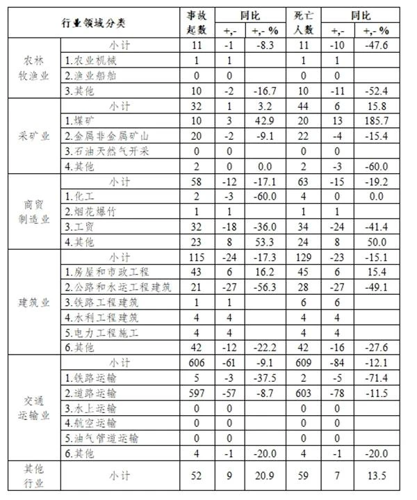 較大事故:煤礦事故3起、死亡12人,同比分別凈增加3起、12人;化工事故1起、死亡3人,同比凈增加1起、3人;工貿(mào)事故1起、同比持平,死亡3人、同比減少3人;房屋和市政工程事故1起、死亡3人,同比均持平;公路和水運(yùn)工程建筑事故1起、同比持平,死亡8人、同比增加5人;鐵路工程建筑事故1起、死亡6人,同比分別凈增加1起、6人;道路運(yùn)輸事故7起、死亡23人,同比分別減少5起、20人;其他行業(yè)事故2起、同比持平,死亡6人、同比減少2人。
