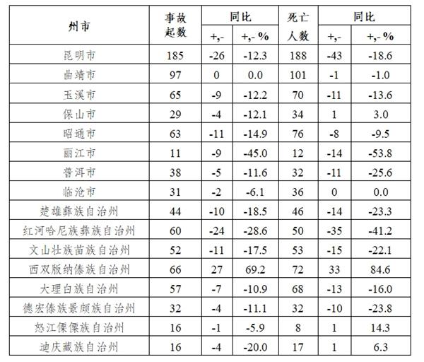 較大事故:昭通市4起、死亡15人,同比分別增加3起、9人;昆明市3起、死亡9人,同比分別減少1起、6人;西雙版納州2起、死亡6人,同比分別凈增加2起、6人;曲靖市1起、死亡3人,同比分別減少2起、10人;玉溪市1起、死亡3人,同比均持平;保山市1起、死亡5人,同比分別凈增加1起、5人;臨滄市1起、死亡3人,同比分別凈增加1起、3人;紅河州1起、死亡3人,同比分別減少1起、4人;大理州1起、死亡8人,同比分別減少2起、3人;省直管區(qū)2起、死亡9人,同比分別凈增加2起、9人。