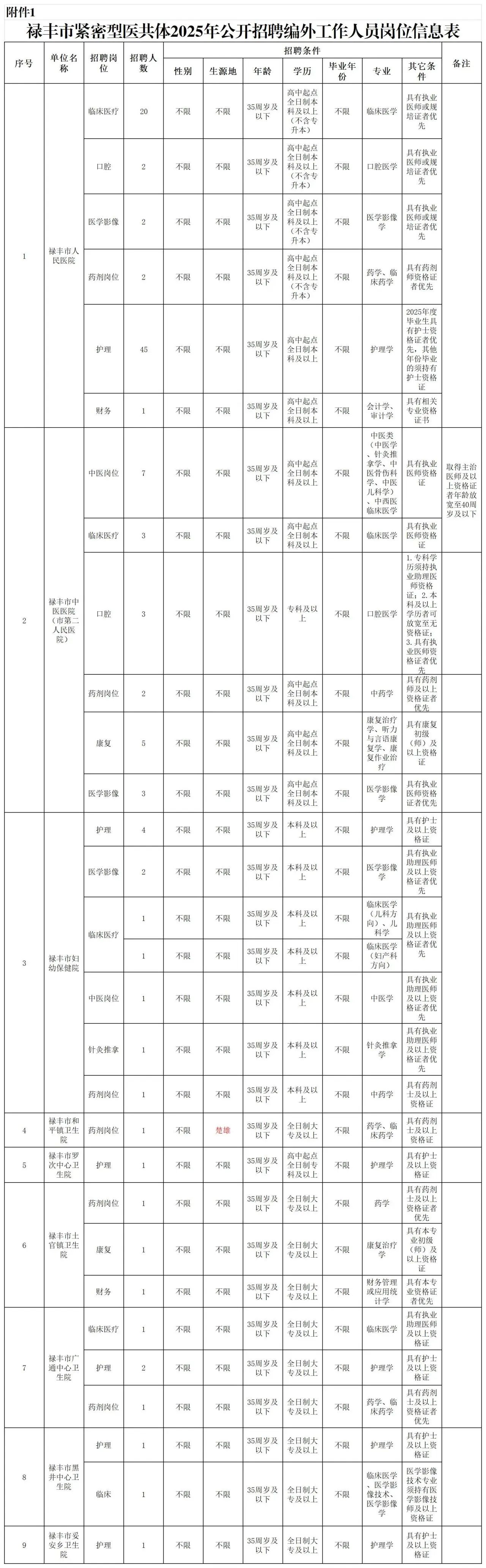 附件:1.祿豐市緊密型醫(yī)共體 2025年公開(kāi)招聘編制外工作人員崗位信息表