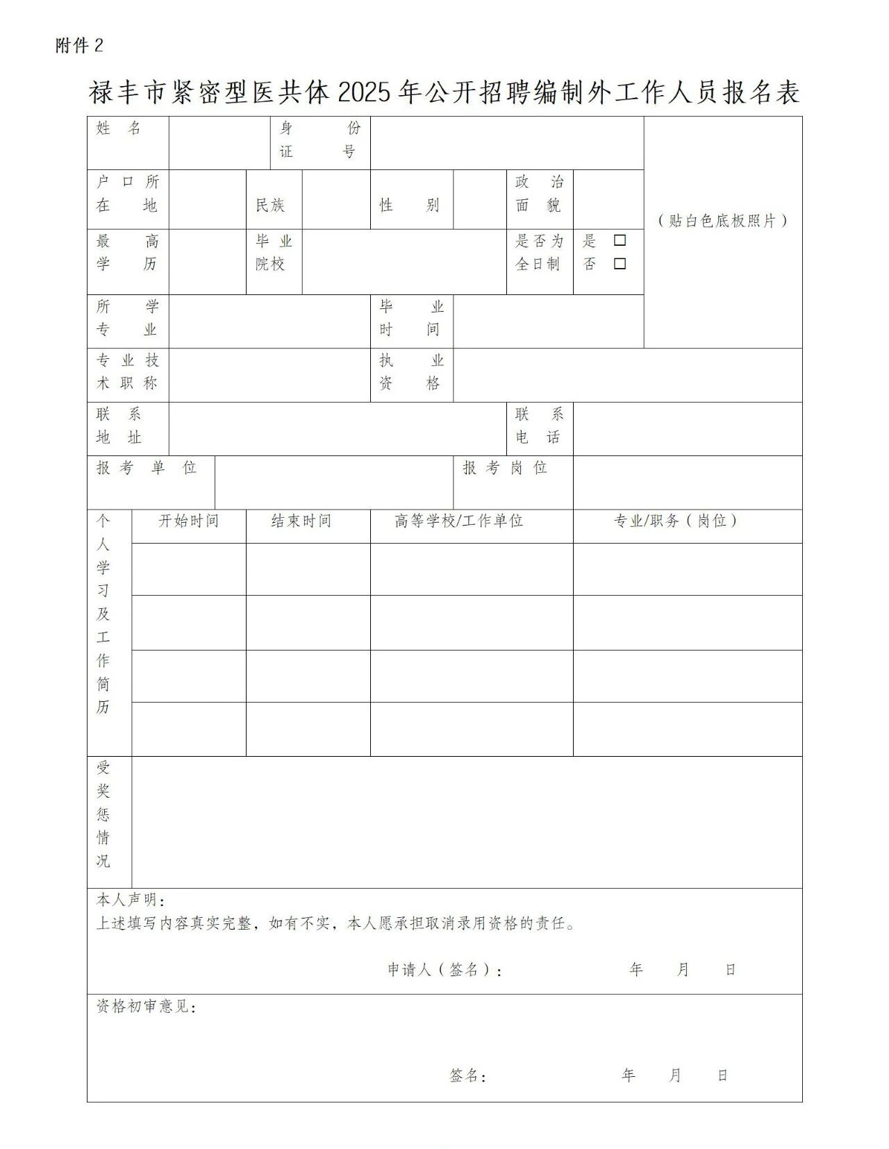 2. 祿豐市緊密型醫(yī)共體2025年公開(kāi)招聘編制外工作人員報(bào)名表