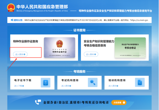 步驟 1:點(diǎn)擊“特種作業(yè)操作證及安全生產(chǎn)知識和管理能力考核合格信息查詢”。