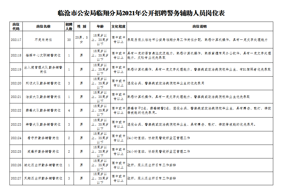 附:臨滄市公安局臨翔分局2021年公開招聘警務(wù)輔助人員崗位表