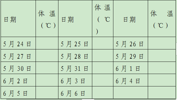 備注:1.考生應(yīng)按上表每日測量體溫、進(jìn)行健康監(jiān)測,如出現(xiàn)發(fā)熱、干咳、流涕等可疑癥狀應(yīng)及時(shí)就醫(yī)。2.入場攜帶本承諾書、核酸檢測證明連同彩打的云南健康碼、通信大數(shù)據(jù)行程卡交考點(diǎn)、考場查驗(yàn)。3.考生對(duì)所填內(nèi)容真實(shí)性負(fù)責(zé)。