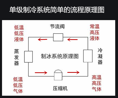 蒸汽壓縮式的冷庫制冷系統(tǒng)的流程原理,仍是大家熟悉的四大過程,即:壓縮——冷凝——節(jié)流——蒸發(fā)。相應(yīng)的配套的主要設(shè)備是制冷壓縮機(jī),冷凝器(風(fēng)冷式或水冷式),節(jié)流閥(氟制冷系統(tǒng)為熱力膨脹閥),蒸發(fā)器(冷庫常用的為直冷排管和風(fēng)冷式風(fēng)機(jī))。