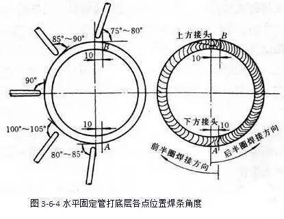 各點位置焊條角度如圖3-6-4及3-6-5所示。前半圈與后半圈相對應(yīng)的焊接位置,焊條角度相同。